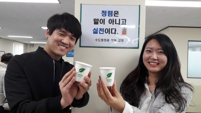 흰색 도자기 재질로 만든 ‘청렴컵’은 녹색 나뭇잎 문양과 ‘청렴약속’이라는 문구가 새겨져 있다. 직원들이 일상 속 청렴 의지를 재확인할 수 있고 종이컵 사용도 줄여서 환경보호와 예산절약의 효과를 거두기 위한 것이다.
