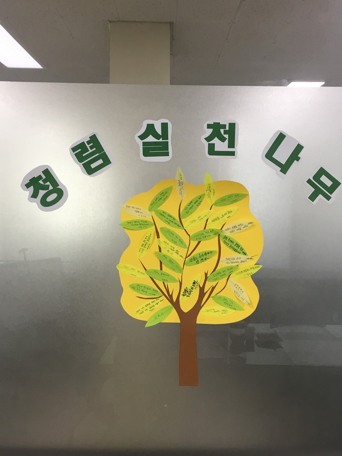 직원들은 부서 사무실 입구에 청렴실천나무를 부착하고 “청렴이란 배려와 섬김을 실천하는 것”, “청렴이 지역을 바꾸고 청렴이 나라를 바꾼다”등 문구를 적은 나뭇잎 스티커도 장식했다. 앞으로 청렴실천의 결과를 적은 열매 스티커도 부착할 계획이다.