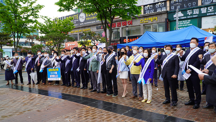 ▲정장선 평택시장이 4일 평택역 광장에서 열린 발대식에 참석해 시민들을 독려하며 인사말을 하고 있다. |