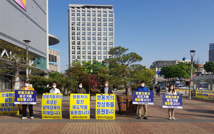 이밖에도 지난 3일에는 평택민생실천위원회, 민주당평택시평당원협의회, 한국우리사주조합총연합회, 평택대학교 총동문회 등 평택 지역사회 시민들이 평택역 앞에서 쌍용차 응원 캠페인을 펼쳤다.