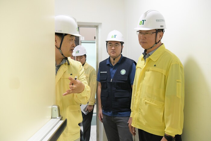 ▲ 노사합동 사업장 위험성평가 집중점검 현장 사진. 한국농수산식품유통공사 기노선 부사장(우측 1번째), 이원규 노동조합 수석부위원장(우측 2번째) |