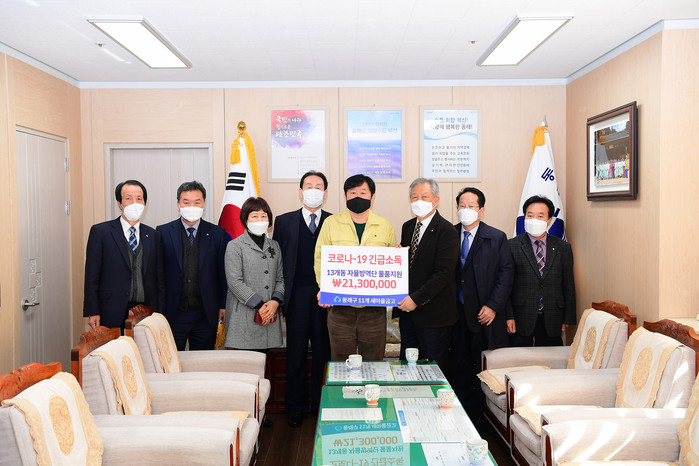 [로컬세계 맹화찬 기자]부산 동래구 11개 새마을금고(새마을금고이사장 협의회 회장 박상혁)에서는 지난 11일 구청장실에서 새마을금고이사장 등 10여 명이 참여한 가운데 코로나19 확산 차단을 위한 긴급소독용 방역 물품 구입비 등 2,130만원을 동래구 관내 13개동 자율방역단에 전달했다.