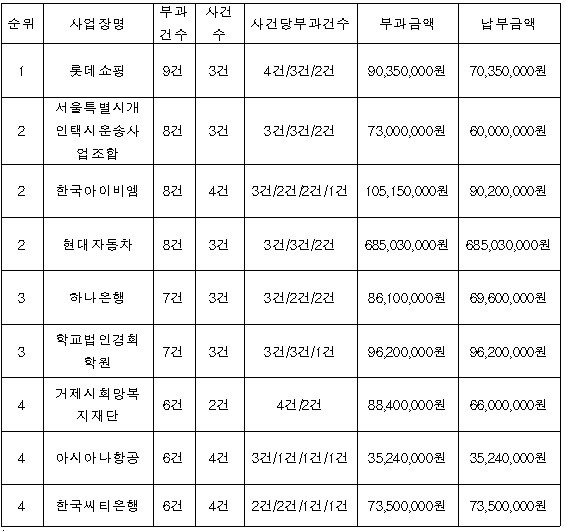 이어 서울특별시개인택시운송사업조합·한국아이비엠·현대자동차가 8건으로 2위, 하나은행·학교법인경희학원이 7건으로 3위, 거제시희망복지재단·아시아나항공·한국씨티은행이 6건으로 4위를 기록했다.