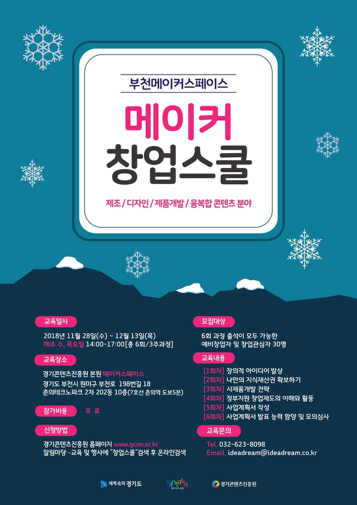참가를 희망하는 예비창업자는 경기콘텐츠진흥원 홈페이지(www.gcon.or.kr)나 부천메이커스페이스(032-623-8098)로 문의하면 된다.