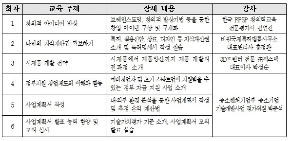 전체 과정의 80% 이상 교육 수료자는 지식재산권, 시제품제작, 사업계획서, 창업자금 분야 전문가와 1:1 멘토링을 할 수 있는 기회를 받는다.