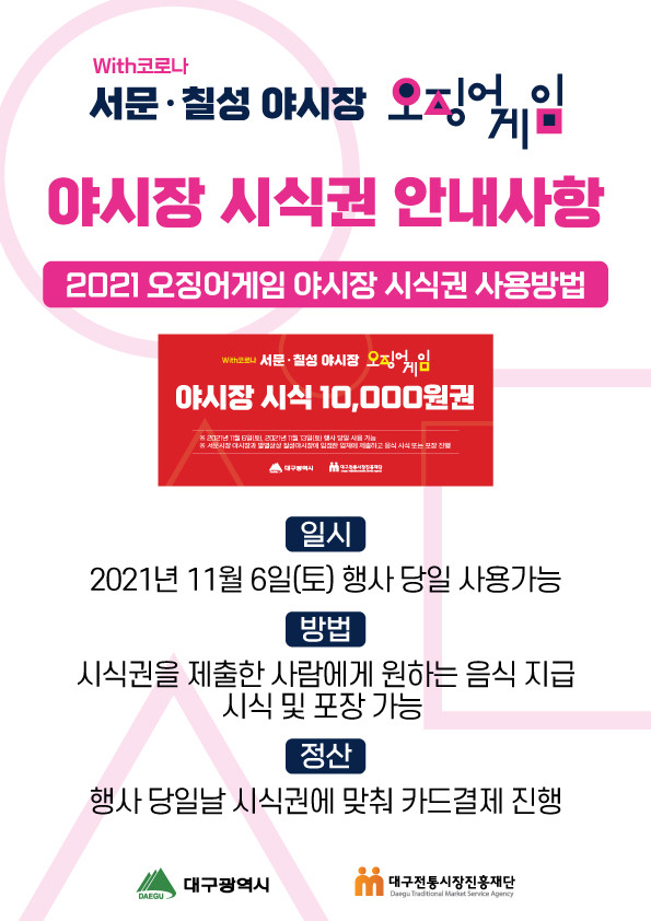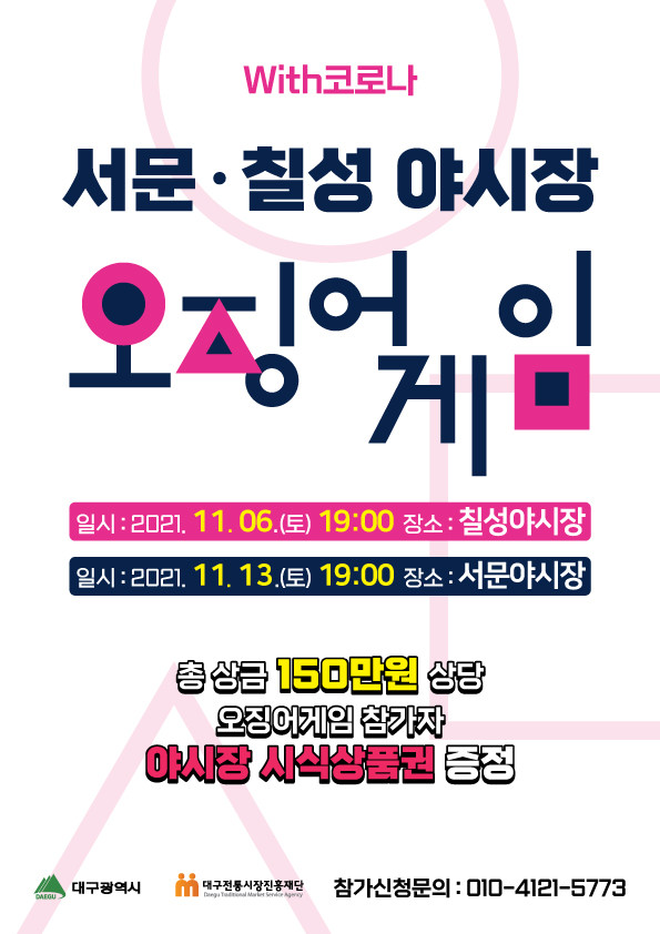 [로컬세계 박세환 기자]단계적 일상회복에 발맞춰 코로나19로 침체된 대구시 북구 칠성야시장에 활력을 불어넣기 위해 넷플릭스 드라마 '오징어 게임'을 모티브로 하는 '야시장 오징어 게임'이 개최된다.