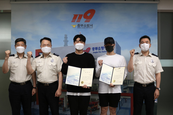 [로컬세계 맹화찬 기자]부산 중부소방서는 3일 오전 중부소방서에서 화재현장 유공 시민 2명에게'기관장(서장) 표창'을 수여했다고 밝혔다.