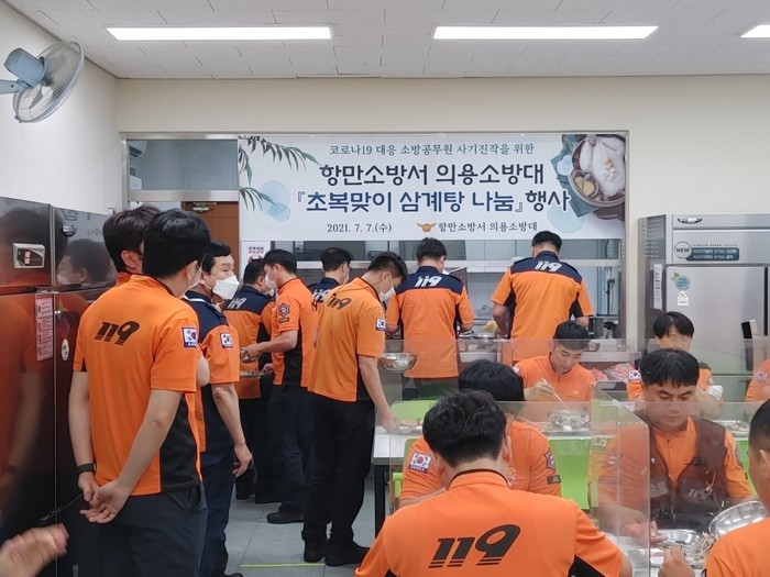 [로컬세계 맹화찬 기자]부산 항만소방서 남ㆍ여 의용소방대(대장 강동일, 이현주)는 7일 소방대원 90여명에게 점심으로 삼계탕을 제공하는 삼계탕 나눔DAY 행사를 진행했다고 밝혔다.