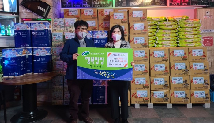 [로컬세계 박세환 기자]대구 북구 태전2동 소재 참 좋은 공연 봉사단(단장 문배)은 지난 4일 읍내동 행정복지센터(동장 조귀애)에 관내 어려운 이웃을 위해 백미(10kg) 50포, 라면 50박스, 휴지 24롤을 기탁했다.