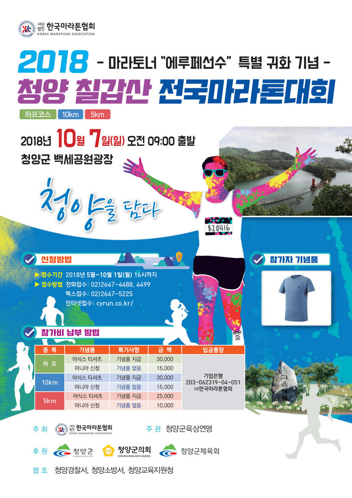 한국마라톤협회가 주최하고 청양군육상연맹(회장 이양주)이 주관하는 이번 대회는 케냐 출신 마라토너 윌슨 로야나에 에루페(30·청양군청 소속)의 지난달 3일 대한민국 특별귀화 승인을 기념하며 올해 처음으로 개최한다.