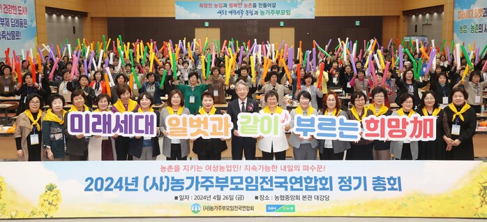 농협중앙회(회장 강호동)와 (사)농가주부모임전국연합회(회장 박민숙, 이하 '농가주부모임')은 26일 서울 중구 농협중앙회 본관에서 ‘미래세대 일벗과 부르는 희망加’라는 슬로건 아래 2024년 정기총회를 개최했다.