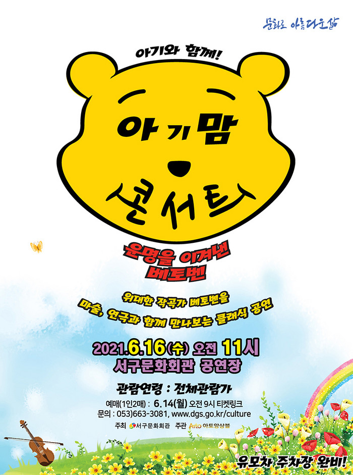 서구문화회관 관계자는 “육아와 코로나에 지친 부모들을 위해 평일 낮 특별한 음악회를 준비했다”면서“온 가족이 함께 즐기고 클래식에 대한 흥미를 느낄 수 있는 이색 경험이 되길 바란다”고 전했다.