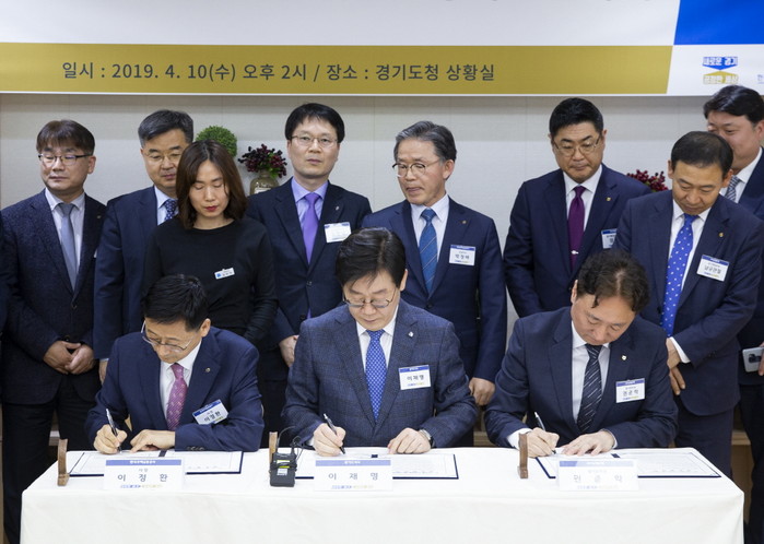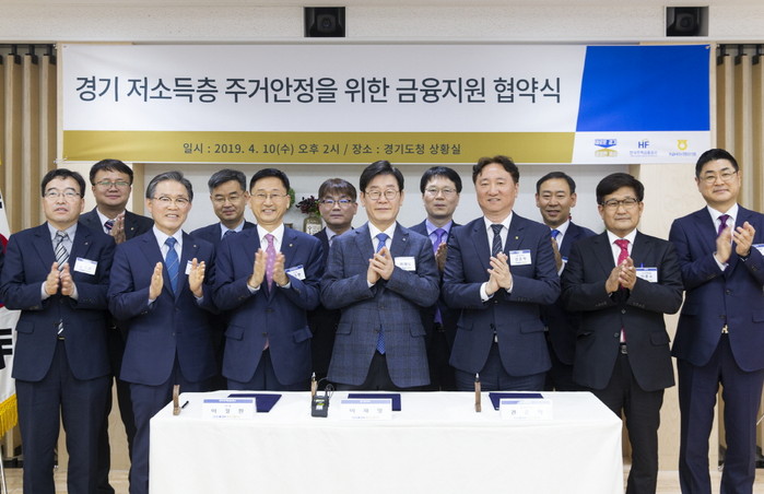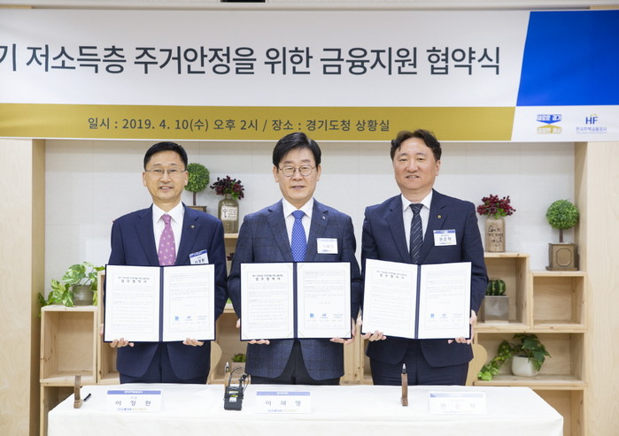 이재명 경기도지사와 이정환 한국주택금융공사 사장, 권준학 NH농협은행 경기본부장은 10일 도청 상황실에서 이런 내용을 담은 ‘경기 저소득층 주거안정을 위한 금융지원 업무협약서’에 서명했다.