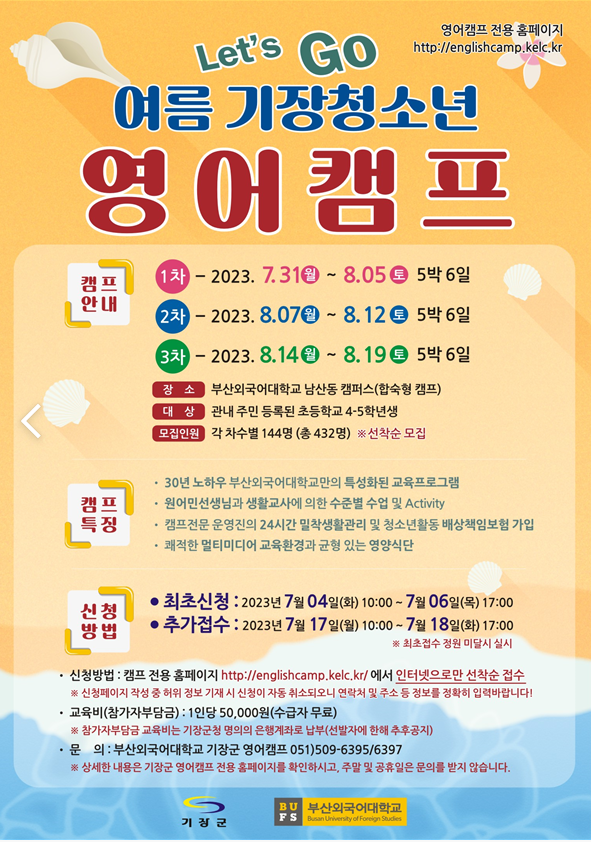 부산외국어대학교에서 주관하는 ‘2023년 하계 기장 청소년 영어캠프’는 원어민 강사와 함께하는 합숙형 영어체험 활동 프로그램으로 오는 7월 31일부터 8월 19일까지 1회 5박 6일의 기간으로 총 3회로 진행되며, 차수별로 각 144명을 모집한다.