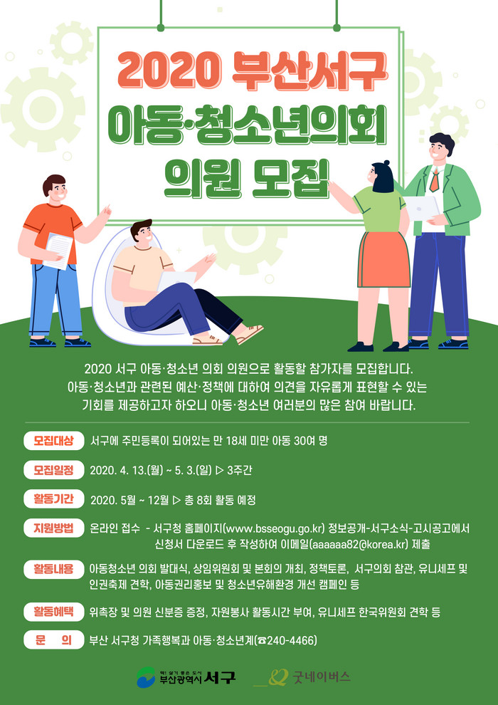 [로컬세계 맹화찬 기자]부산 서구(구청장 공한수)가 아동의 권리를 보장하고 선도적인 아동친화도시 조성을 위해 ‘2020년 아동·청소년의회 의원’을 공개모집한다.
