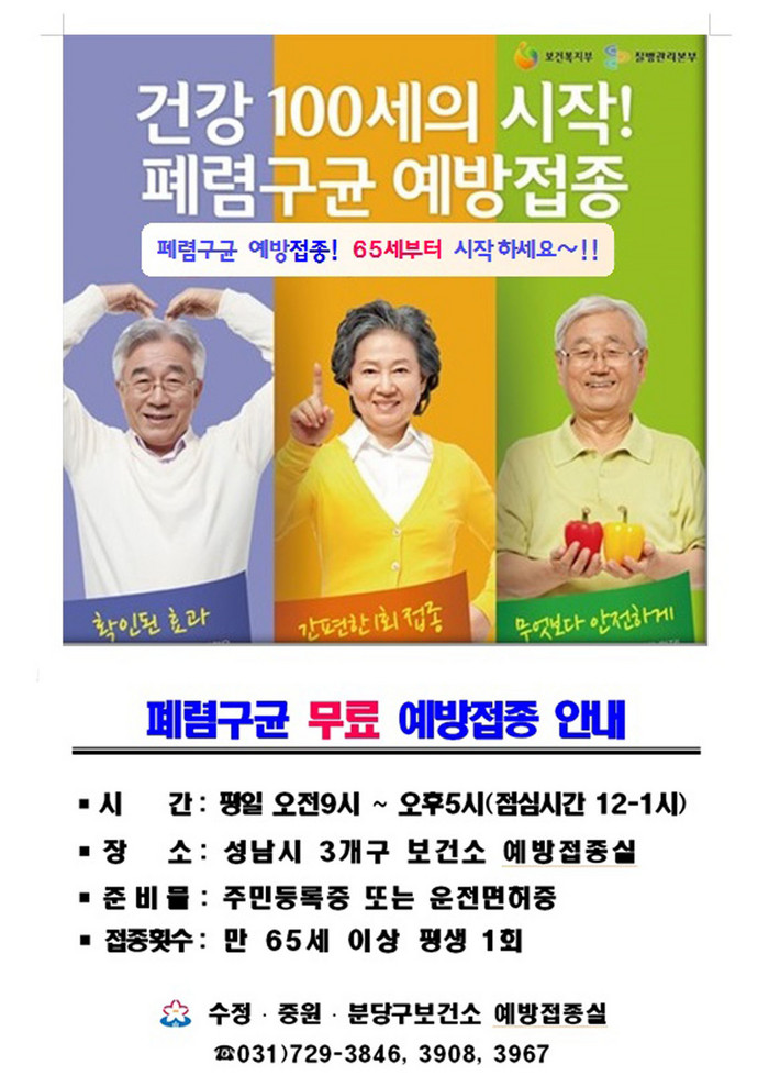 성남 3개구 보건소는 23개 종류의 혈청형이 있는 ‘폐렴구균 23가 다당질 백신’을 접종한다. 만 65세를 맞게 되는 1952년생은 생일이 지나지 않았어도 올해부터 모두 접종 대상이다.