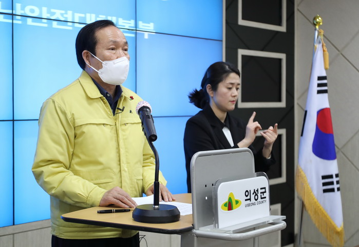 ▲김주수 군수가 코로나 확진현황을 브리핑 하고 있다. 의성군 제공 |