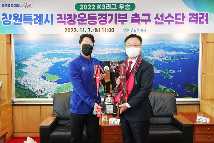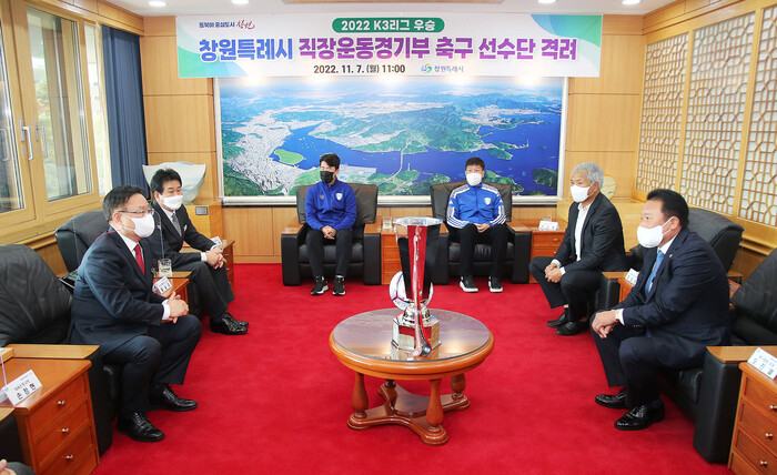 [로컬세계=정판주 기자]경남 창원특례시는 7일 ‘2022 K3리그’에서 우수한 성적으로 우승한 시 축구단 감독 등 선수단 및 축구협회 관계자를 시청으로 초대해 우승 트로피 전달받고 축하와 격려의 자리를 마련했다.