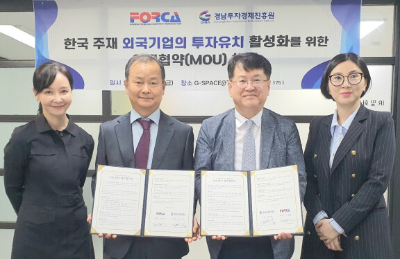 ▲ ‘G-스페이스 팁스’에서 재단법인 경남투자경제진흥원과 한국외국기업협회 대표가 최근 투자 유치 업무협약 체결 후 기념촬영을 하고 있다. [사진=경남도제공] |