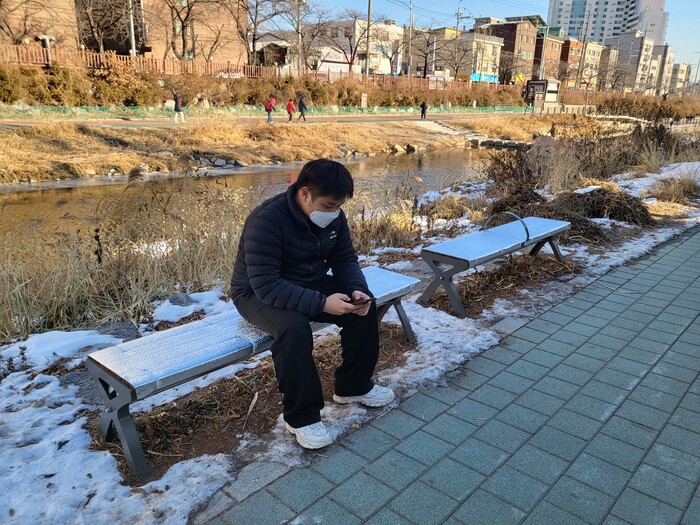 ▲ 보온덮개가 설치된 벤치에서 우이천을 이용하던 시민이 휴식을 취하고 있다. 강북구 제공 |