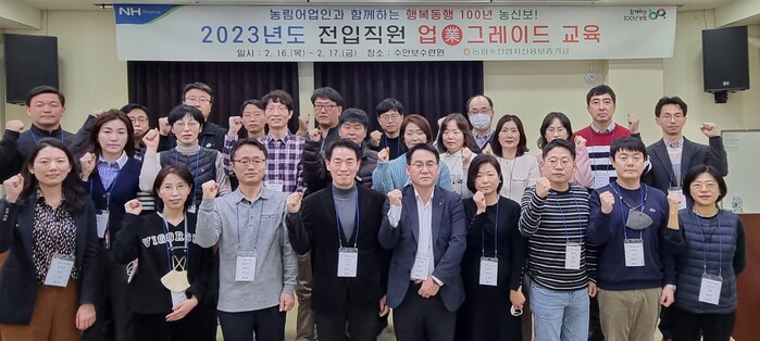 ▲ 농림수산업자신용보증기금 전입직원들은 16일 NH농협생명 수안보수련원에서 실시하는 '2023년 전입직원 업그레이드 교육'의 입교식 후 기념촬영하고 있다. 농협 제공 |