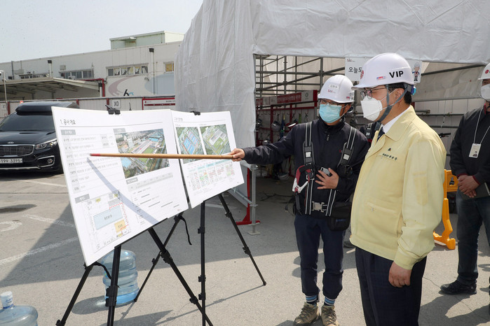 이번 방문은 ICT를 적용해 생산성 극대화를 위해 진행중인 LG전자 제1공장 증축 공사장의 공사 진행사항 확인과 지난 29일 경기도 이천 물류 창고시설 화재로 인하여 많은 사망자가 발생됨에 따라 건축공사장 안전수칙 준수와 코로나19 예방 대책 등 현장에서 뜻하지 않게 발생할 수 있는 긴급 재난사항에 대한 예방대책을 위한 방문을 실시했다.