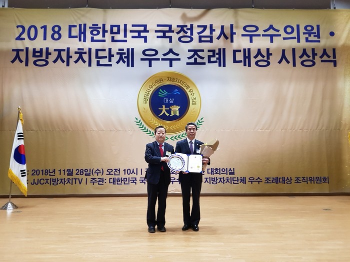 | ▲박인범 의원이 28일 지방자치 TV가 주관한 ‘2018 지방자치단체 우수 조례 대상’ 수상자로 선정되면서 기념사진을 찍고 있다.(동두천시의회 제공) |