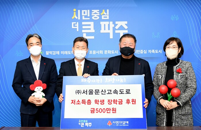서울문산고속도로는 사회공헌사업의 일환으로 파주시 취약계층 학생을 위해 후원금을 전달하게 됐으며, 앞으로도 장학금 사업을 통해 사회공헌사업을 이어가 지역사회복지증진에 기여하겠다고 밝혔다.