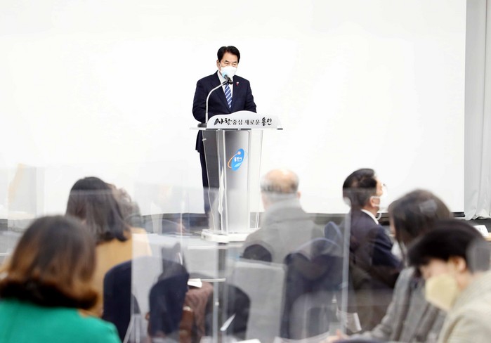 | ▲백군기 용인시장이 6일 용인시청에서 열린 '2021 용인시 청소년 성문화 실태에 관한 심포지엄'에서 인사말을 하고 있다. 용인시 제공 |