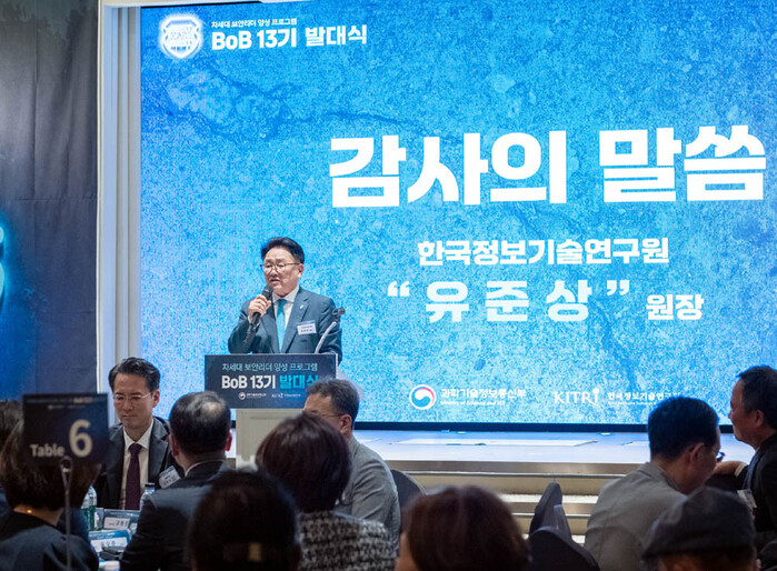 ▲차세대 보안리더 양성 프로그램(BoB) 13기 발대식에서 한국정보기술연구원 유준상 원장이 감사의 말씀을 전하고 있다. |