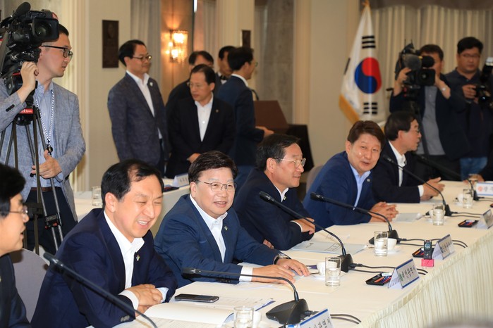 ▲권선택 대전시장(왼쪽 세 번째)이 김기현 울산시장, 유정복 인천시장, 권영진 대구시장 등과 대화를 나누고 있다. |