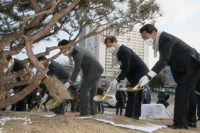 | ▲백군기 용인시장이 3일 용인특례시 출범을 기념하는 식수행사에서 참석자들과 소나무를 심고 있다. |