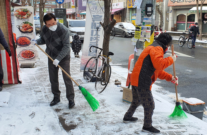 ▲17일 유덕열 동대문구청장을 비롯한 동대문구청 및 동 주민센터 직원들이 도로 곳곳의 제설 작업을 진행했다. |