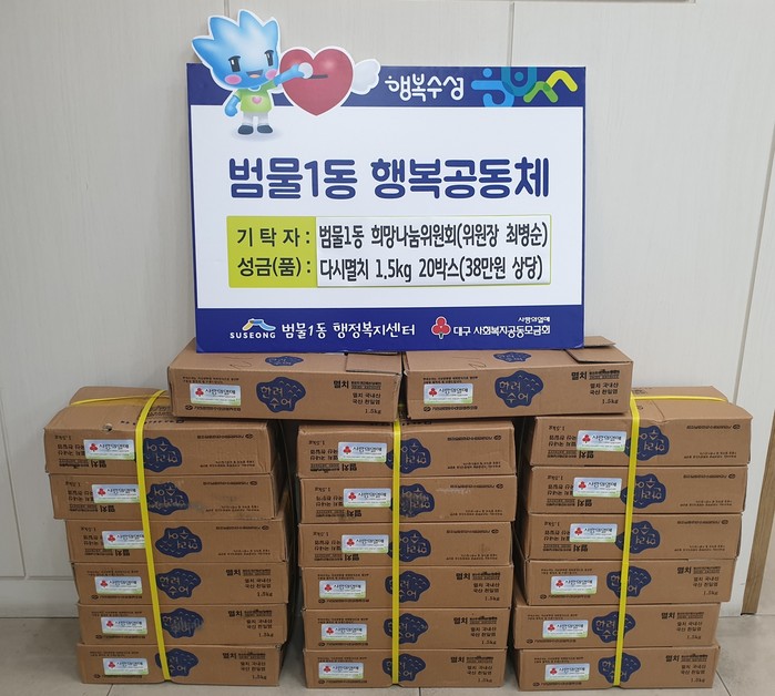 [로컬세계 박세환 기자]대구 수성구 범물1동 희망나눔위원회(위원장 최병순)는 1일 저소득 취약계층 20세대에 국내산 다시멸치(1.5kg) 20박스(38만원 상당)를 전달했다.