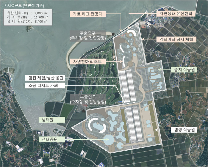 1단계로 2024년까지 ‘갯벌세계유산센터’를 짓고, 2단계로 염생식물원, 자연생태원, 소금관련 6차 산업화 단지를 조성한다. 이후 순차적으로 생태공원과 생물원 등이 들어설 예정이다.