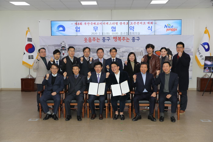 [로컬세계 맹화찬 기자]부산 중구(구청장 권한대행 부구청장 송종홍)는 부산국제코미디페스티벌조직위원회(집행위원장 김준호)와 11일 ‘제8회 부산국제코미디페스티벌 광복로 오픈콘서트’ 의 성공적 추진과 중구 자갈치시장에 설치 될 등대모형의 홍보 및 활용 등과 관련한 업무 협약식을 개최했다.