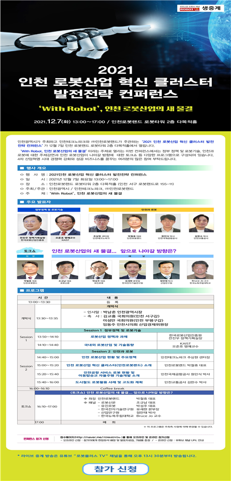 이번 행사는 코로나19 상황을 감안해 온·오프라인 병행방식으로 당일‘로봇플러스 TV’유튜브 채널을 통해 생중계된다. 컨퍼런스 참가는 인터넷 주소 http://naver.me/FDWdDYDo 로 신청하면 된다.