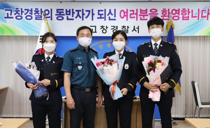 고창경찰서의 새 가족이 된 신임 순경들은 축하 꽃다발을 전달받고, 앞으로의 당찬 포부를 밝혔다.