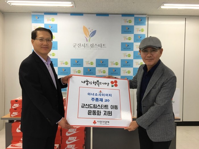▲주종재 전 군산대학교 교수는 9일 전라북도사회복지공동모금회를 통해 군산시드림스타트 취약계층 아동에게 운동화 50켤레를 전달했다.(군산시 제공) |