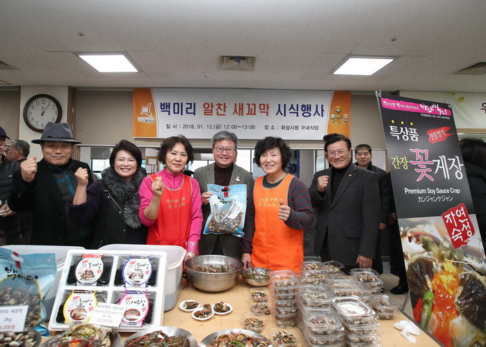 | ▲화성시청에서 열린 백미리 새꼬막 시식행사에 참여한 채인석 화성시장(가운데)과 조성원 경기남부수협조합장(맨오른쪽) |