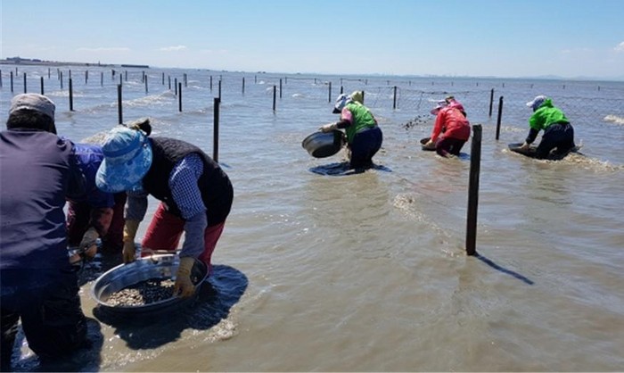 | ▲지난해 6월 백미리양식장에서 어린 새꼬막을 살포하고 있는 모습. |