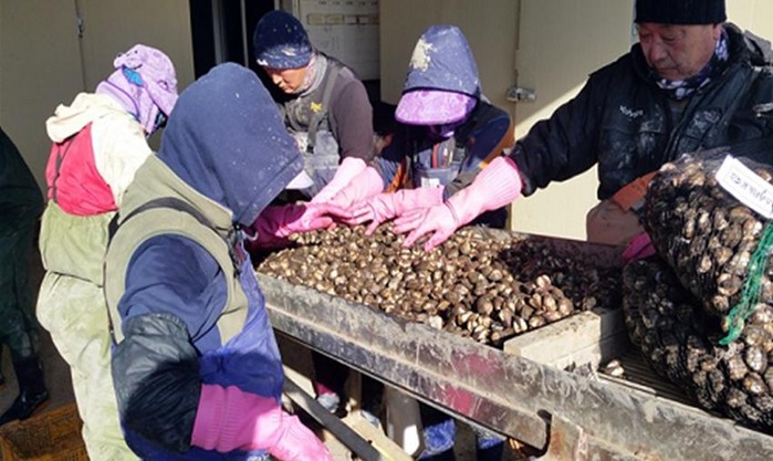 | ▲지난 1월 백미리어촌계에서 새꼬막 채취 후 선별하고 있는 모습. |
