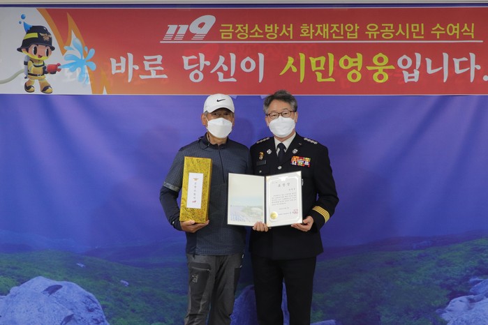 [로컬세계 맹화찬 기자]부산 금정소방서는 지난 1일 금정구 부곡동 소재 음식점화재 시 공사장 내 상수도 호스를 약 40M 전개해 신속한 초기 진화로큰 화재를 막은 유공시민에게 ‘화재진압유공’을 인정해 9일 표창을 수여하는 행사를 가졌다고 밝혔다.