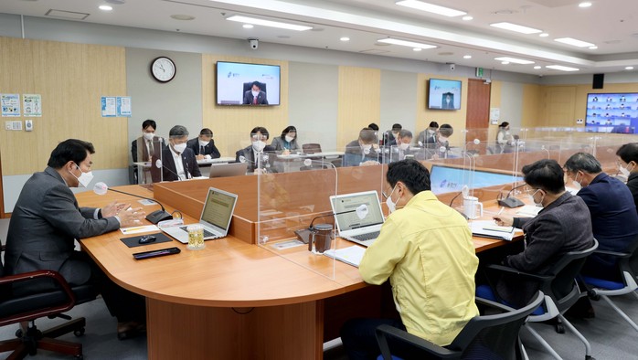 | ▲백군기 용인시장이 13일 시정전략회의에서 재택치료추진단 구성에 대해 논의하고 있다. 용인시 제공 |