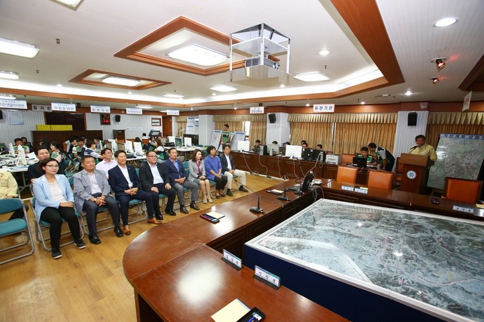 ▲유성구의회 민태권 의장을 비롯한 의원들이 23일 유성구청 4층 대회의실에 마련된 을지연습 종합상황실을 방문해 주요 상황을 보고받고 있다. |