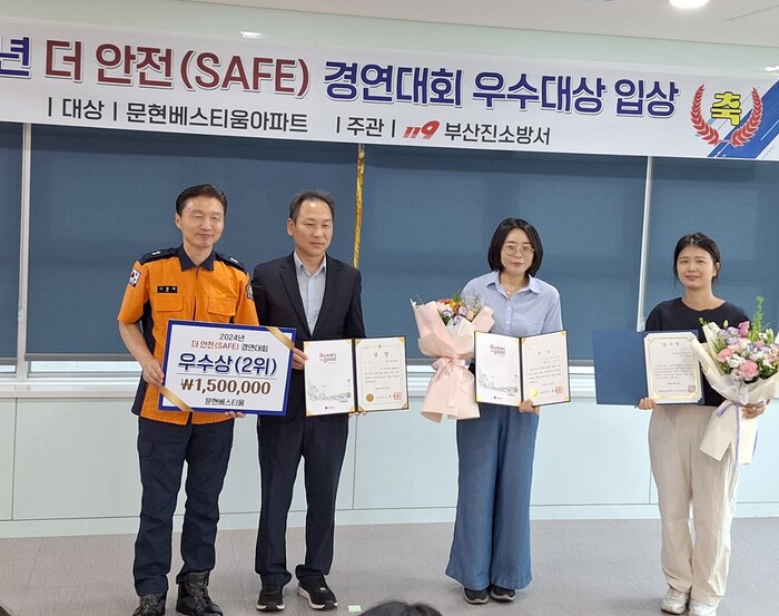[로컬세계 부산=맹화찬 기자]부산진소방서는 남구 문현동 소재 문현베스티움아파트가 ‘공동주택 더 안전(safe)경연대회’에서 우수대상으로 선정되어 시상식 및 현판 제막식 행사를 개최했다고 25일 밝혔다.