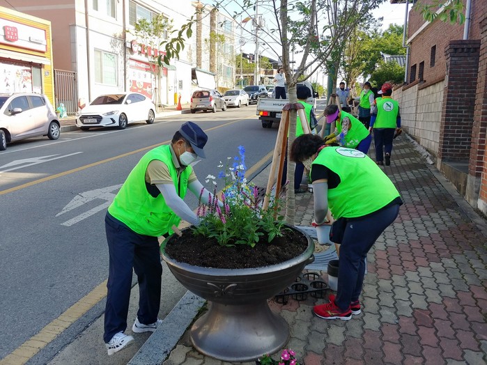 | ▲지난 16일 의성지역 6개 사회단체 회원들이 여름꽃을 심고 있다.(의성군 제공) |