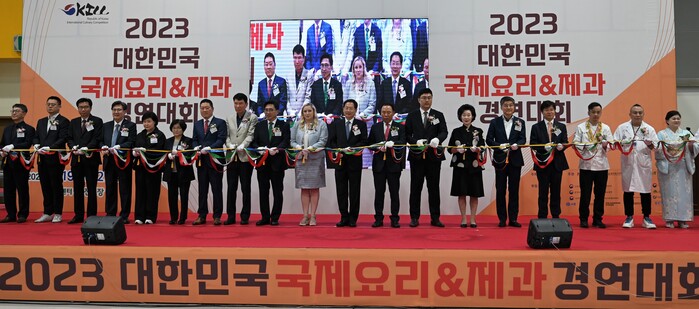 ▲ 국제요리&제과경연대회 연계 ‘공공급식 요리경연대회’ 개막식. (왼쪽 9번째부터) 한국농수산식품유통공사 김춘진 사장, 리사 엘렌 주한미국대사관 농업무역관장, 국제요리&제과경연대회 오제세 대회장. aT 제공 |