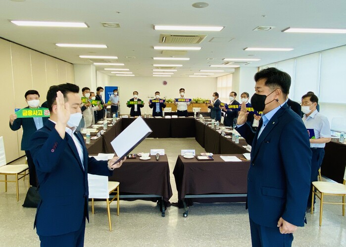 | ▲서울농협은 19일 서서울농협에서 '고객신뢰 회복과 임직원 윤리의식 자정 결의대회'를 개최했다. (우측 농협서울지역본부 황준구 본부장)/ 서울농협 제공 |