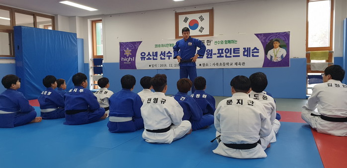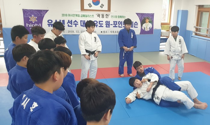 이날 곽동한 선수는 사북 초·중학교 유도 꿈나무 17명을 위해 하루 강사가 되어 아이들을 지도했다.